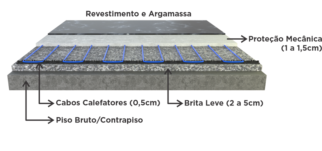 O Piso Aquecido é um sistema de aquecimento elétrico controlado por termostato digital ou analógico. Permite controlar a temperatura de um ambiente grau a grau. O processo de funcionamento é muito simples: Sob o piso são instalados cabos calefatores que ao serem ligados irradiam calor para todo o ambiente a partir do chão. Dessa forma, o calor tem origem no piso e tende a subir obedecendo a mais básica das leis da física: o ar quente sobe e o ar frio desce.